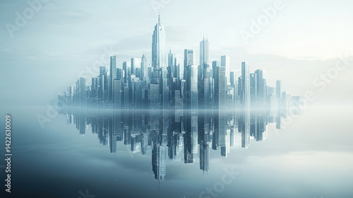 © Dusit, Naklejka premium A serene futuristic cityscape with skyscrapers reflected on calm water, evoking sense of symmetry and modern elegance