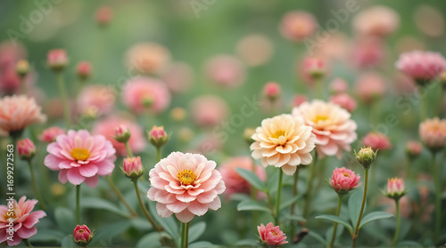 Obraz premium A Serene Garden of Pink and Peach Zinnia Flowers in Full Bloom with a Soft...