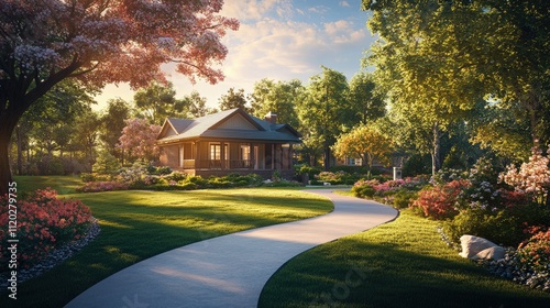Naklejka premium A serene garden with a charming house surrounded by vibrant flowers and lush...