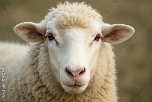 © Oleg, Obraz premium A serene gaze of a white sheep against a soft green backdrop