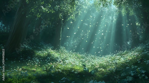 © Tonadech, Fototapeta premium A serene glade illuminated by soft light filtering through crystal leaves creating a peaceful sanctuary for woodland creatures