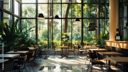 Naklejka premium A serene glass-walled café surrounded by lush greenery, bathed in morning...