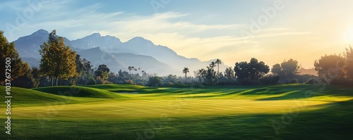 Obraz premium A serene golf course panorama with vibrant greens and a distant mountain...