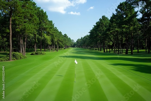 © Thanyarat, Fototapeta premium A serene golf course surrounded by lush trees, with a flag marking the hole visible in the distance