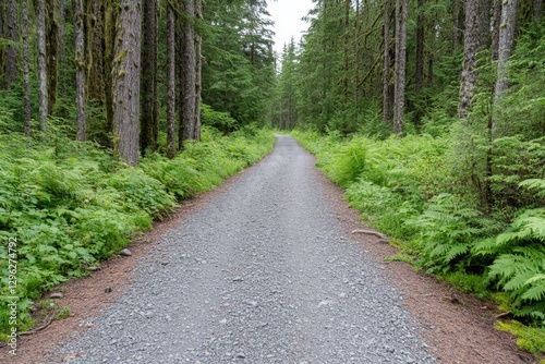 Fototapeta premium A serene green forest path leading into the distance, lined with tall trees and lush foliage, symbolizing tranquility and nature's beauty