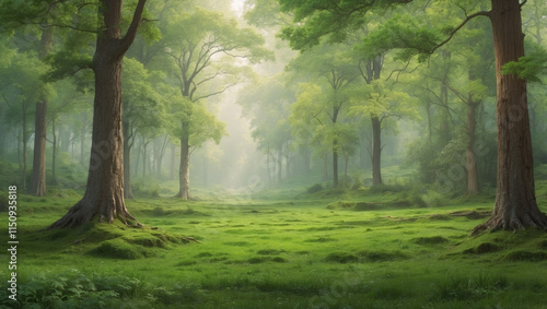 Naklejka premium A Serene Green Forest Scene Evoking Calmness and Tranquility