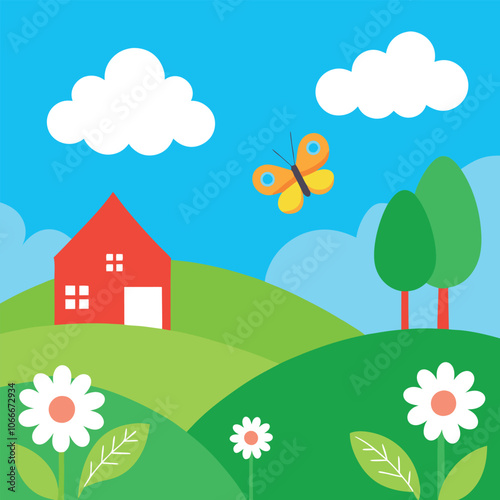Naklejka premium a serene green landscape beneath a blue sky with white clouds. In the...