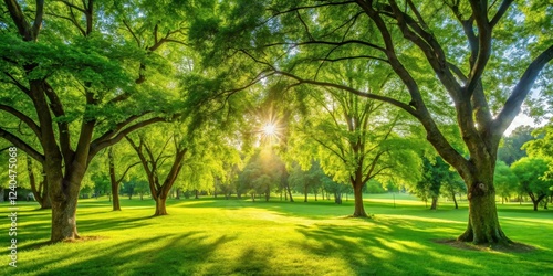 Naklejka premium A serene green park on a sunny day with sunlight filtering through the trees...