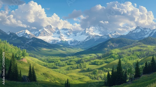 Fototapeta premium A serene green valley with mountains and a bright blue sky, showcasing lush...