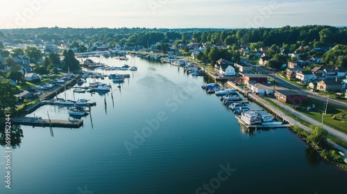 Fototapeta premium A serene harbor with boats docked, surrounded by a small town with houses and...