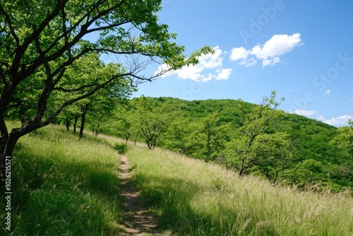 Obraz premium A serene hiking trail meanders through lush green hills under a bright blue sky