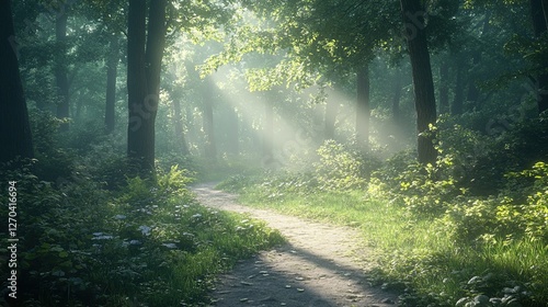 Obraz premium A serene hiking trail through a dense forest with sunlight filtering through the trees