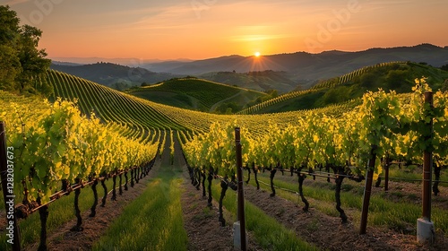 © Nosheen, Naklejka premium A serene hillside vineyard at sunset, with rows of grapevines glowing in the golden light and rolling hills in the background