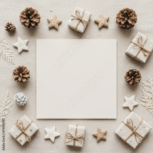 Fototapeta premium A serene holiday-themed arrangement featuring gift boxes, pine cones, and natural elements surrounding a blank square for messages or designs.