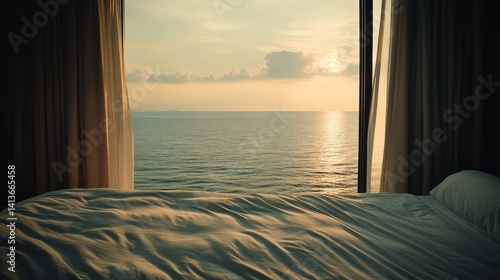 Fototapeta premium A serene hotel room with a stunning ocean view, a comfortable bed, and...