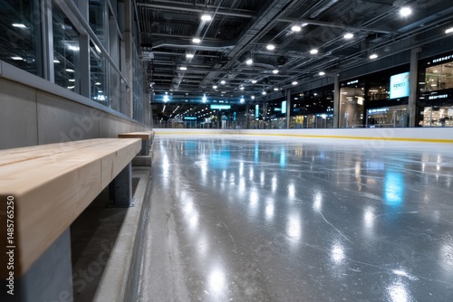 Fototapeta premium A serene ice rink captured at night with bright overhead lights, featuring...