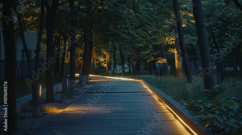 Fototapeta premium A serene, illuminated forest walkway winds through tall trees, creating a...