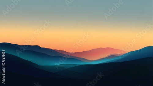 Fototapeta premium A serene illustration of a sunset over mountains with layered hills in gradient colors, evoking peace and tranquility in nature's beauty.