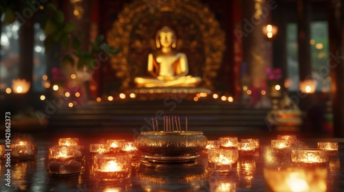 Fototapeta premium A serene image of a Buddhist temple hall, with a golden Buddha statue in the background, surrounded by candles and incense, creating a tranquil setting.