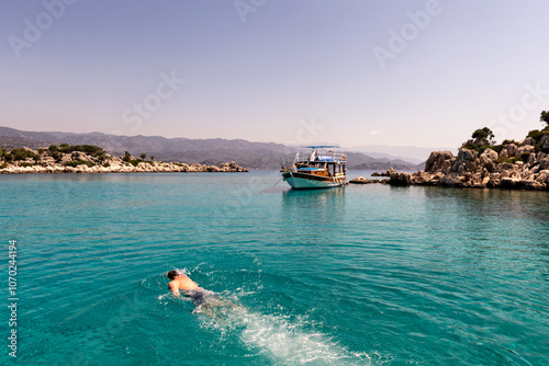 © Hulya, Fototapeta premium A serene image of a person swimming in the crystal-clear turquoise waters near a boat in Kaş, Turkey, surrounded by rocky islets and distant mountains