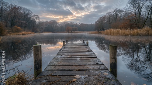Naklejka premium A serene image of a wooden dock extending into a calm lake surrounded by a...