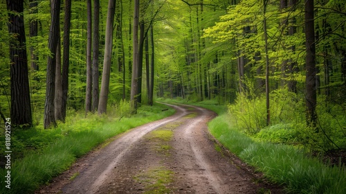 Fototapeta premium A serene image showcasing a winding dirt road meandering through a lush, green forest with tall trees and fresh foliage
