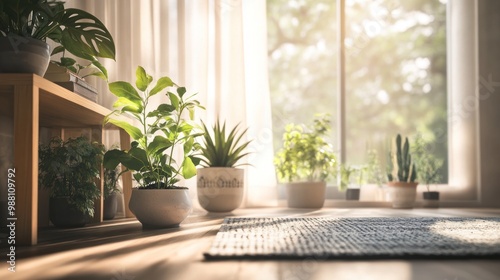 © BerkahStock, Fototapeta premium A serene indoor space filled with various plants, showcasing natural light and tranquility.