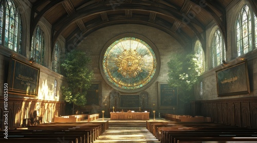 Fototapeta premium A serene interior of a grand chapel with stained glass and seating.