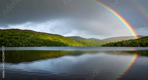 © Shabana, Naklejka premium A serene Irish lake reflecting the vibrant colors of a rainbow, AI Generated