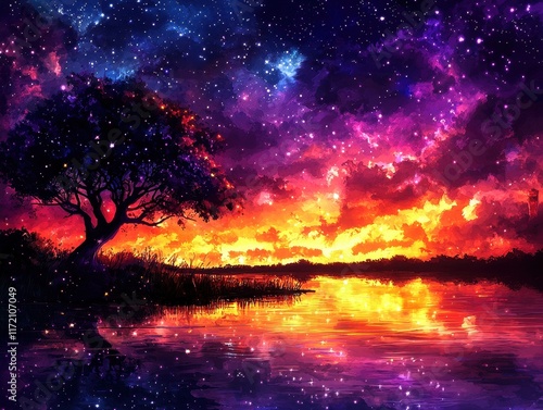 © Junior, Obraz premium A serene island glowing under a twilight sky filled with vibrant stars. The island is home to a colossal glowing tree, its branches stretching high into the heavens, casting light over the radiant
