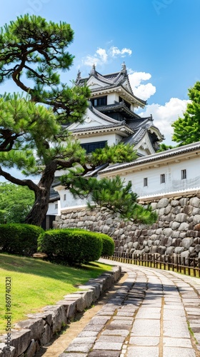 Obraz premium A serene Japanese garden courtyard with lush greenery, stone pathways, and...