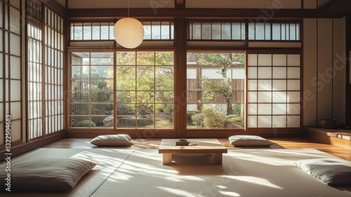 © RaksaLinggo, Obraz premium A serene Japanese interior with a view to a beautiful garden