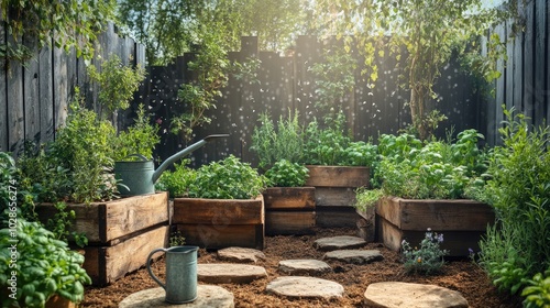 © Sana, Fototapeta premium A serene kitchen garden with rustic wooden planters