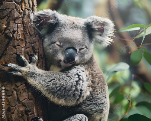 © Thares2020, Obraz premium A Serene Koala Clinging to a Eucalyptus Tree Eyes Closed in Peaceful Sleep Wildlife Portraits Concept