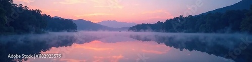 © Supharak wonginyoo, Obraz premium A serene lake at dusk with mist rising from its surface, dusk, mist, peaceful