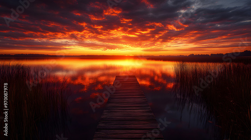 © Finn, Fototapeta premium A serene lake at sunset with a wooden pier extending into the water and the sky ablaze with orange and red hues reflecting on the still surface.