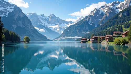 Fototapeta premium A serene lake cradled by majestic mountains, with quaint wooden homes nestled...