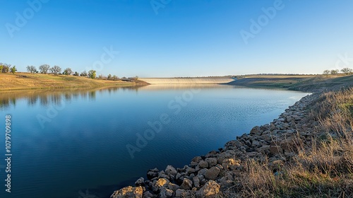 Fototapeta premium A serene lake created by a dam, with calm water reflecting the surrounding...