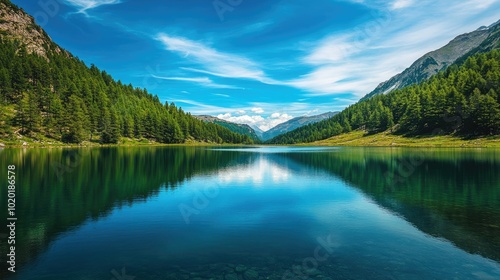 © sarun, Fototapeta premium A serene lake reflecting the deep blue of the sky on a calm, sunny day.
