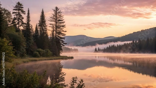 Fototapeta premium A serene lake reflecting the soft light of dawn surrounded by evergreen trees...