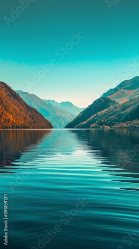 © Leli, Obraz premium A serene lake reflecting the surrounding mountains under a clear blue sky