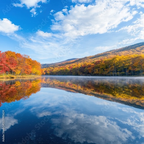 © CHA, Fototapeta premium A serene lake surrounded by autumn foliage.