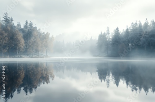 © Tanish, Fototapeta premium A serene lake surrounded by dense fog