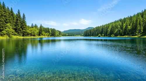 Naklejka premium A serene lake surrounded by lush green forests under a clear blue sky,...