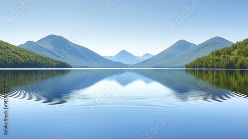 Naklejka premium A serene lake surrounded by lush green mountains and clear blue sky.
