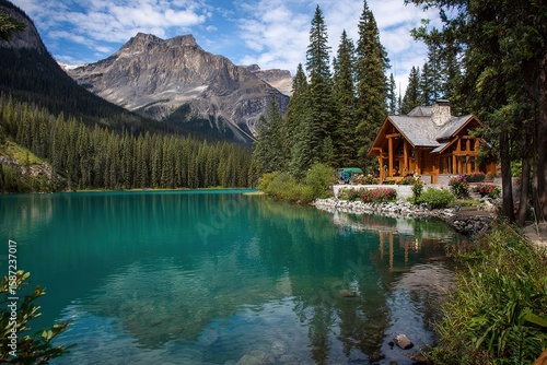 © IRINA, Naklejka premium A serene lake surrounded by tall evergreen trees and majestic mountains. A wooden cabin sits by the water's edge, reflecting the clear blue sky.