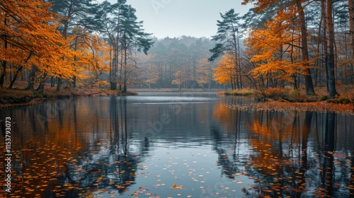 Fototapeta premium A serene lake surrounded by trees with leaves falling