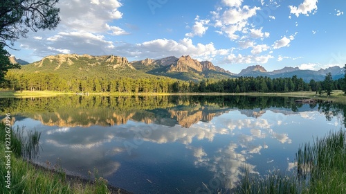 © Veayo, Fototapeta premium A serene lake view with mountains reflected on the calm surface.