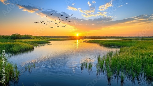 © Hammam, Fototapeta premium A serene lake with a sunset and birds flying over, in a grassy field.