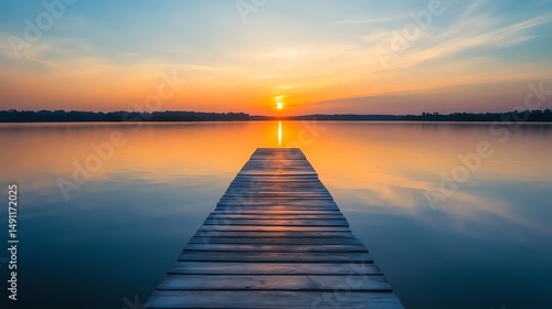 Naklejka premium A serene lake with a wooden dock extends into the water, creating a peaceful...